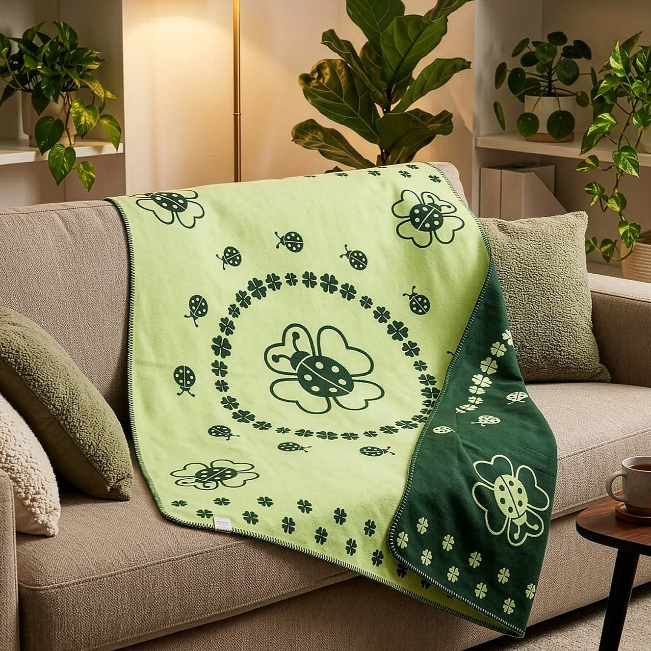 „Jetzt wird alles gut.“ Diese glückbringende Botschaft strahlen die verspielten Symbole auf der Decke aus. Und augenblicklich wird dir bewusst, inmitten all der Marienkäfer und Kleeblätter kann alles nur gut werden.