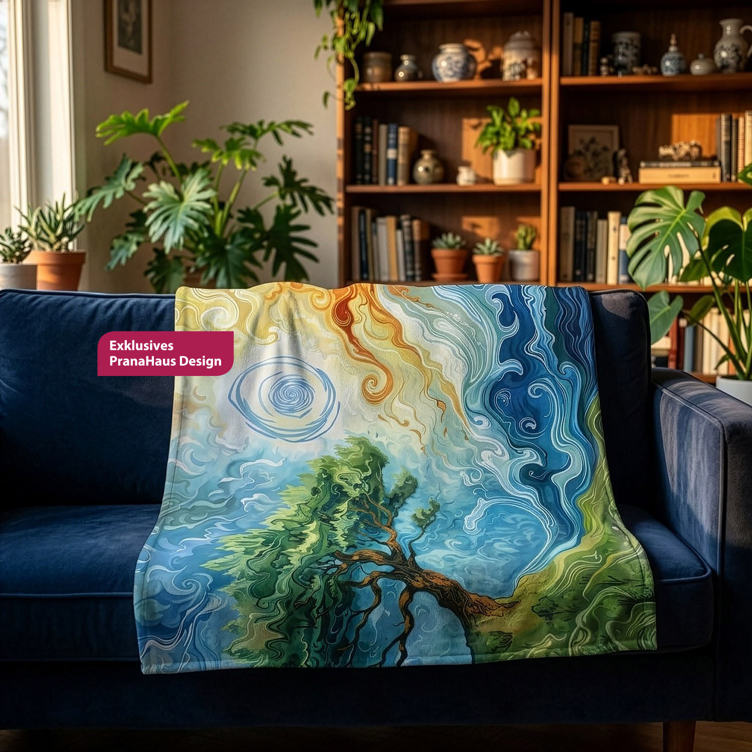 Diese Decke ist schön wie ein Gemälde - und dazu überaus praktisch. Sie kann dich das ganze Jahr über energetisch begleiten, im Winter wie an kühlen Sommertagen. Hülle dich darin ein und spüre die Urkräfte von Feuer, Erde, Luft und Wasser.
